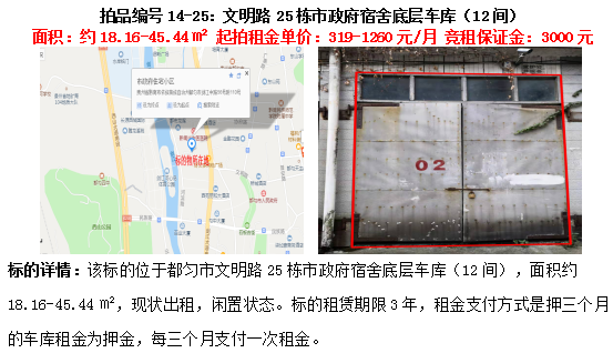 13、文明路25棟市政府宿舍底層車庫(12間)3年租賃權(quán)(面積約18.16㎡-45.44㎡)。