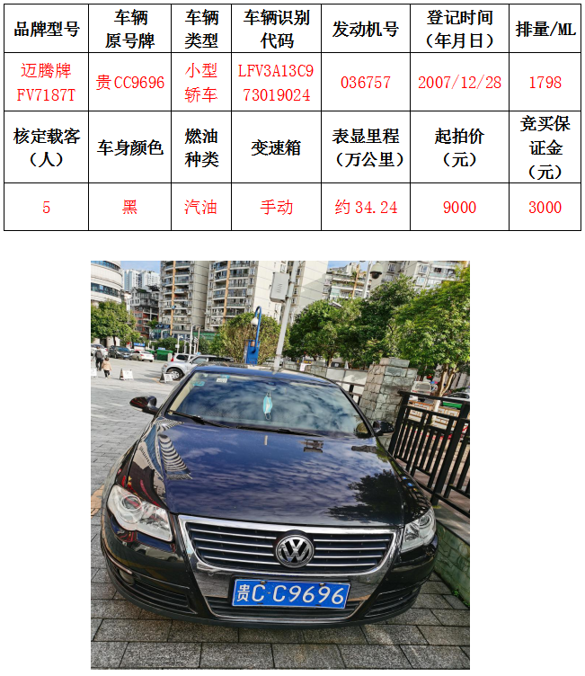 拍品編號(hào)2:邁騰牌FV7187T小型轎車一輛
