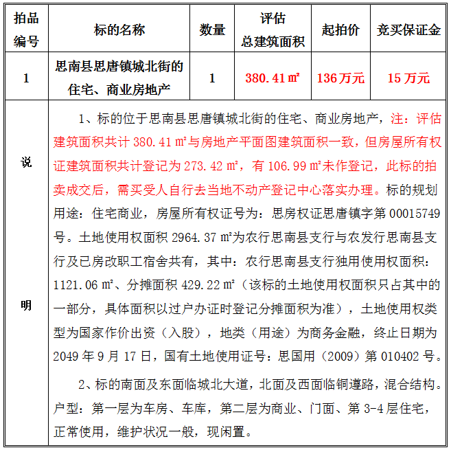 1、思南縣思唐鎮(zhèn)城北街的住宅、商業(yè)房地產(chǎn),建筑面積共:380.41㎡;起拍價(jià):136萬(wàn)元;競(jìng)買(mǎi)保證金15萬(wàn)元。