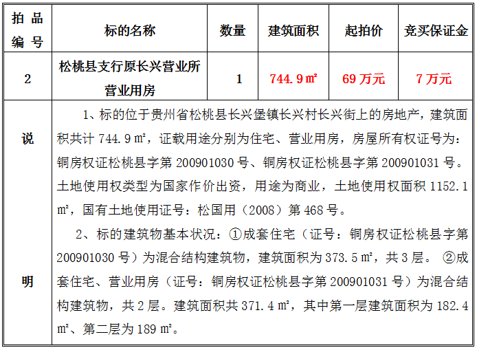 2、松桃縣支行原長(zhǎng)興營(yíng)業(yè)所營(yíng)業(yè)用房,建筑面積共:744.9㎡;起拍價(jià):69萬(wàn)元;競(jìng)買(mǎi)保證金:7萬(wàn)元