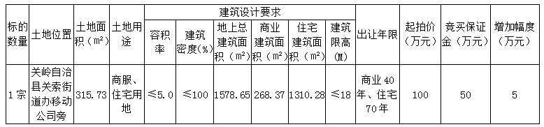 (一)本次出讓地塊:關(guān)嶺自治縣關(guān)索街道一宗國有出讓建設(shè)用地使用權(quán),詳見宗地圖,土地用途為商服、住宅用地,出讓年限為商業(yè)40年、住宅70年。