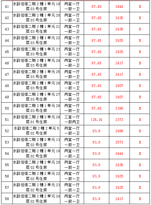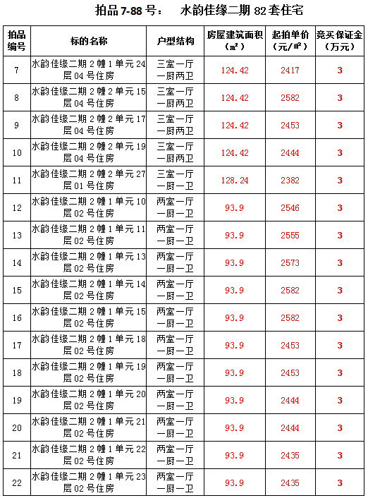 2、水韻佳緣82套住宅房產(chǎn),建筑面積:87.45—128.24㎡,起拍價:2373—2582元/㎡;