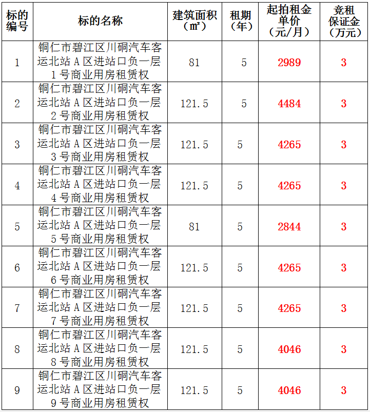 1、銅仁市碧江區(qū)川硐汽車客運北站A區(qū)進站口負一層1號門面租賃權,面積:81㎡,租賃期:5年,起拍租金單價:2989元/月,競租保證金:3萬元;
