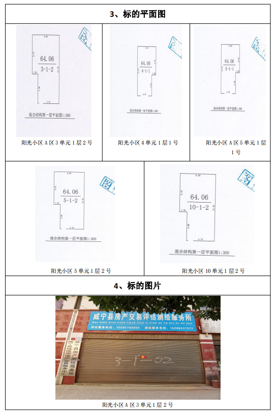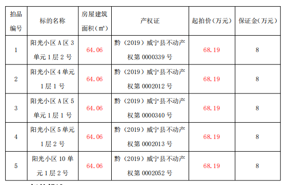 拍品編號1-5號標(biāo)的位于威寧縣海邊街道廣園路陽光小區(qū),房屋結(jié)構(gòu)均為:混合結(jié)構(gòu),權(quán)利性質(zhì):國有土地/出讓/其他,用途:商服用地/商業(yè)服務(wù),使用期限:2012年12月20號至2052年12月19日。