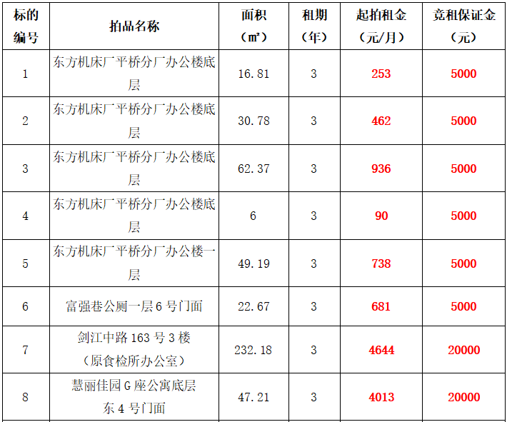 1.本次拍賣標(biāo)的共計(jì)47個(gè),均以現(xiàn)狀出租,其中:1—9號(hào)標(biāo)的目前為租賃狀態(tài),如承租人參與競(jìng)租,其享有同等價(jià)位優(yōu)先承租權(quán),其余標(biāo)的均為閑置狀態(tài)。