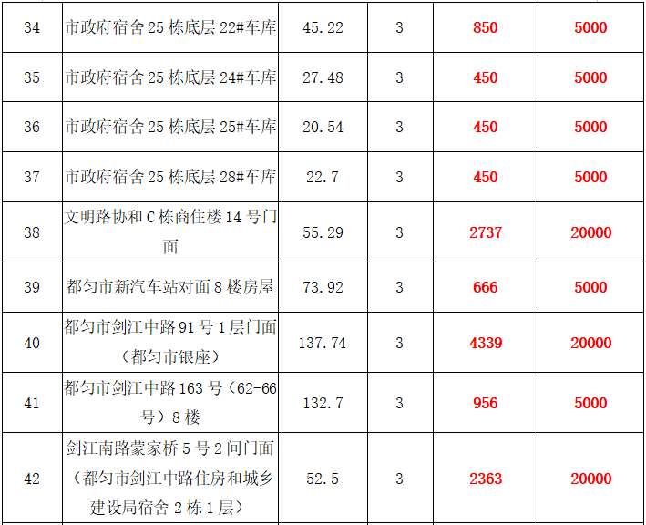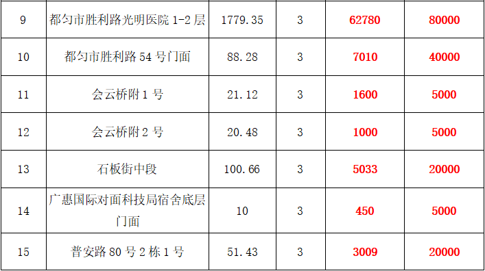 2、都勻市勝利路、劍江中路、劍江南路、富強(qiáng)巷、會(huì)云橋、石板街、普安路、七星城6號(hào)樓、文明路、蠟紙廠、民族路、大興街等18處門面或辦公用房3年租賃權(quán),面積約9㎡-1779.35㎡;