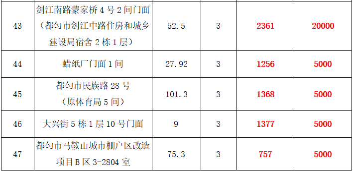 3、都勻市慧麗佳園、廣惠國際對(duì)面科技局、新華公寓、新汽車站對(duì)面、馬鞍山城市棚戶區(qū)等5處房屋3年租賃權(quán),面積約10㎡-91.84㎡;