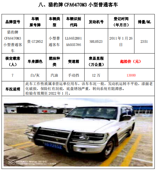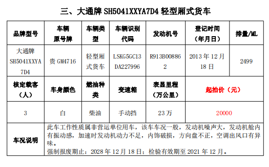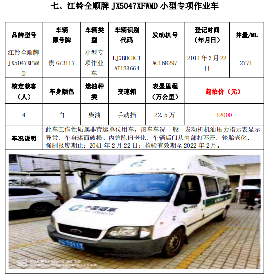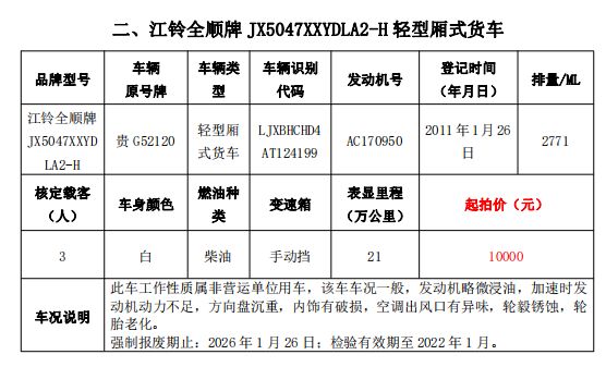 受委托,我公司于2021年12月14日(星期二)下午14:30在貴州省貴陽(yáng)市中華南路20號(hào)新大陸數(shù)碼廣場(chǎng)10樓D座會(huì)議室公開(kāi)拍賣(mài)以下標(biāo)的:大通牌SH5041XXYA7D4輕型廂式貨車(chē)2輛、大通牌SH5041XXYA6D4輕型廂式貨車(chē)1輛、江鈴全順牌JX5047XXYDLA2-H輕型廂式貨車(chē)2輛、江鈴全順牌JX5047XFWMD小型專(zhuān)項(xiàng)作業(yè)車(chē)1輛、五十鈴牌QL1020UGDSC輕型普通貨車(chē)1輛、獵豹牌CFA6470M3小型普通客車(chē)1輛、獵豹牌CFA6470LA小型越野客車(chē)1輛,共計(jì)9輛車(chē)整體拍賣(mài)。
