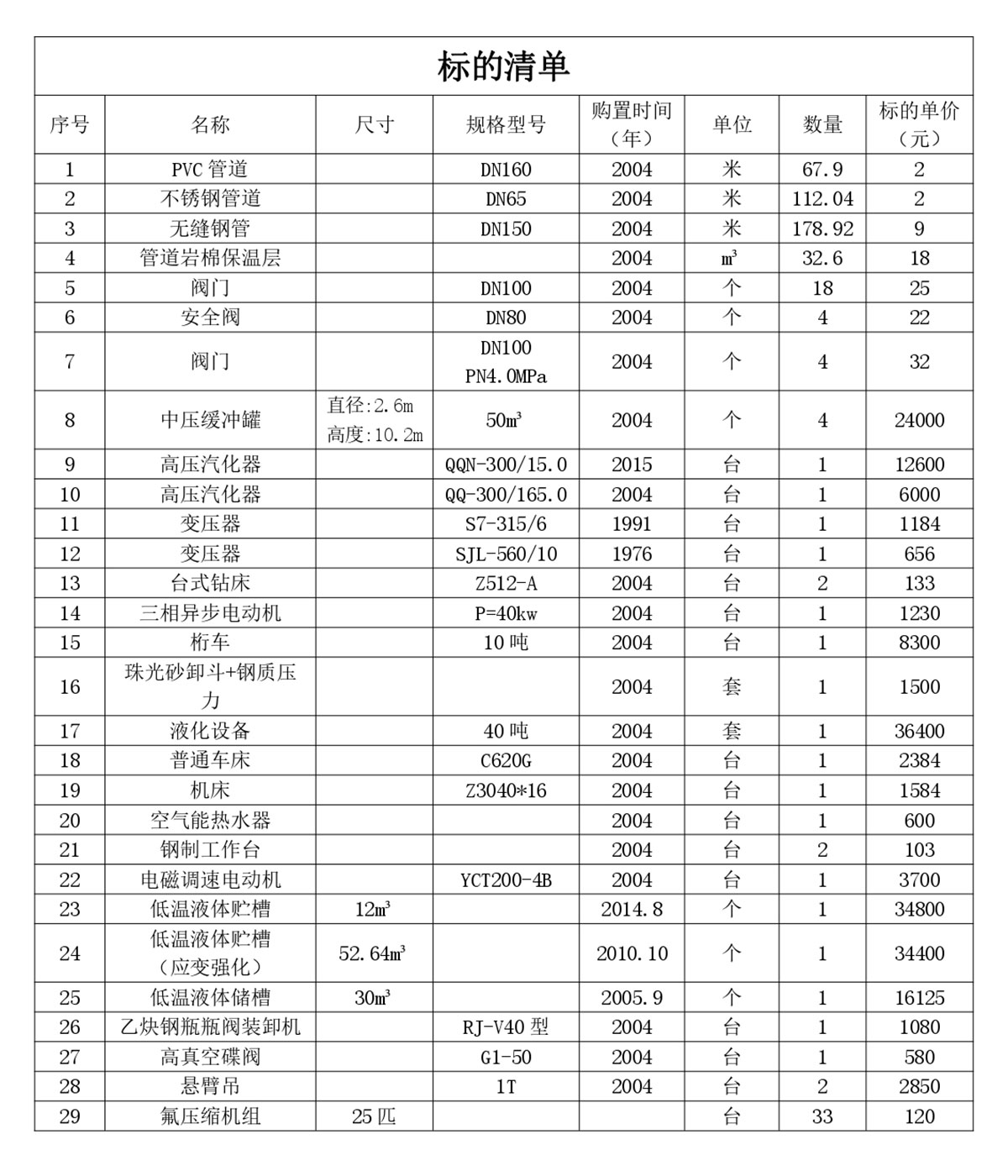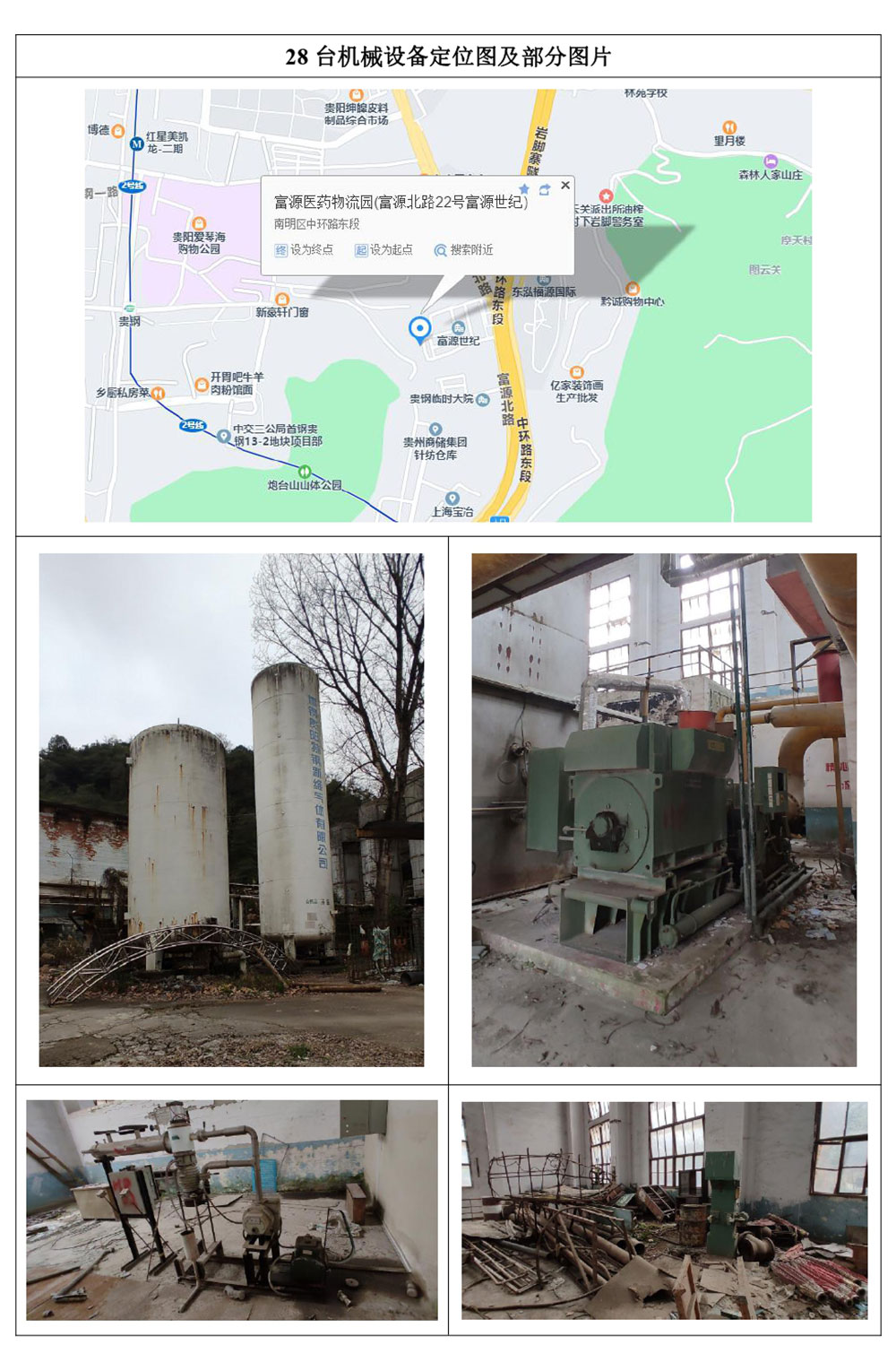 1、28臺(tái)機(jī)械設(shè)備屬于貴陽(yáng)美佳220千伏變電站輸變電工程項(xiàng)目,現(xiàn)位于貴陽(yáng)市南明區(qū)油榨街10號(hào),包含管道、鋼管、管道巖棉保溫層、閥門(mén)、安全閥、中壓緩沖罐、高壓汽化器、變壓器、臺(tái)式鉆床、三相異步電動(dòng)機(jī)、桁車(chē)、珠光沙卸斗+鋼質(zhì)壓力、液化設(shè)備、普通車(chē)床、機(jī)床、空氣能熱水器、鋼制工作臺(tái)、電磁調(diào)速電動(dòng)機(jī)、低溫液體儲(chǔ)槽、乙炔鋼瓶瓶閥裝卸機(jī)、高真碟閥、懸臂吊等,從1976年到2015年間陸續(xù)購(gòu)入,目前閑置,無(wú)維護(hù)保養(yǎng)。