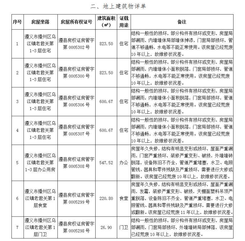 標(biāo)的名稱:遵義市播州區(qū)烏江鎮(zhèn)老君關(guān)三宗工業(yè)用地及地上住宅、辦公、食堂、門衛(wèi)用房等房地產(chǎn)