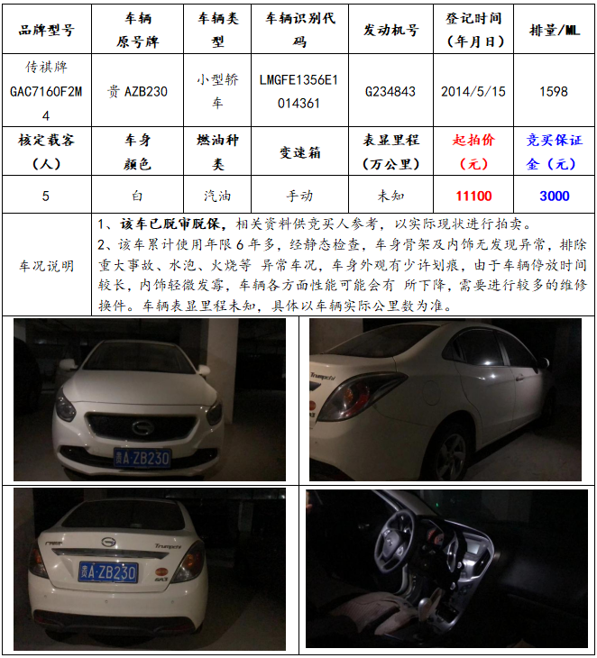 拍品編號1:傳祺牌GAC7160F2M4小型轎車一輛