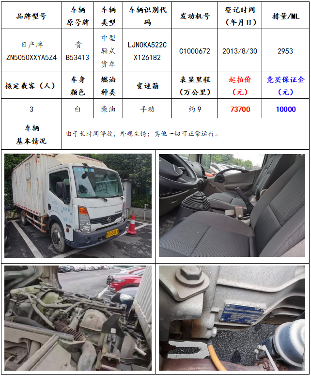 拍品編號6:日產(chǎn)牌ZN5050XXYA5Z4中型廂式貨車一輛
