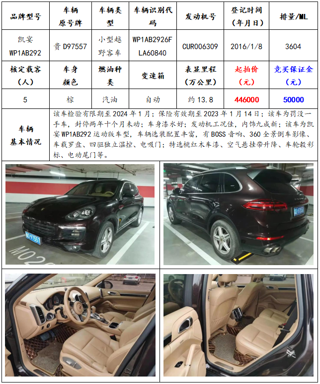 拍品編號12:凱宴WP1AB292小型越野客車一輛