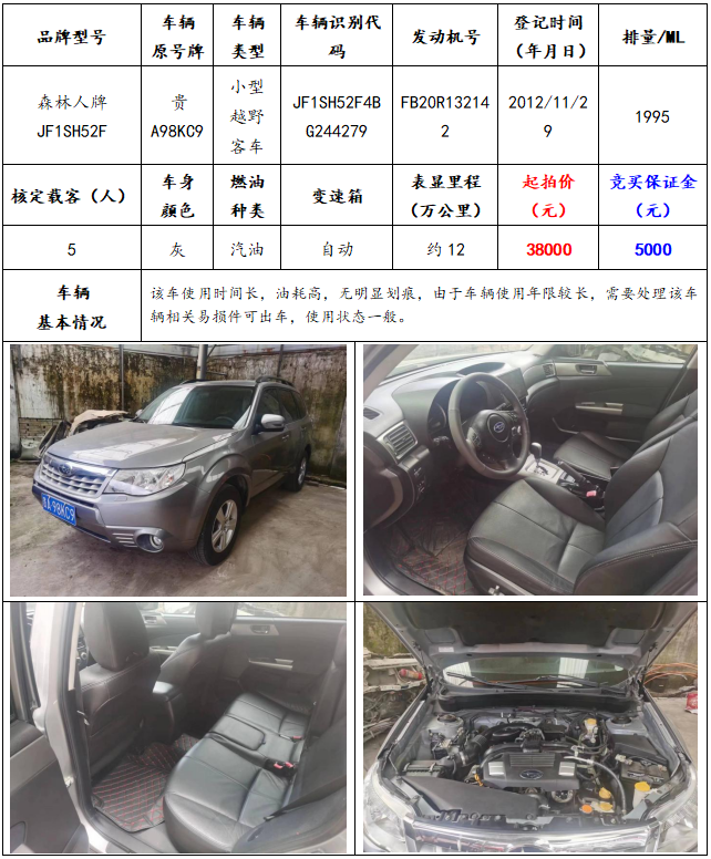 拍品編號11:森林人牌JF1SH52F小型越野客車一輛