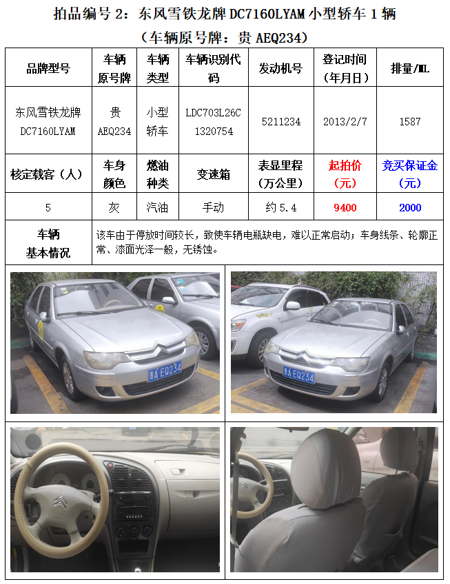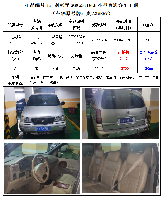 別克牌SGM6511GL8小型普通客車1輛;東風(fēng)雪鐵龍牌DC7160LYAM小型轎車1輛。