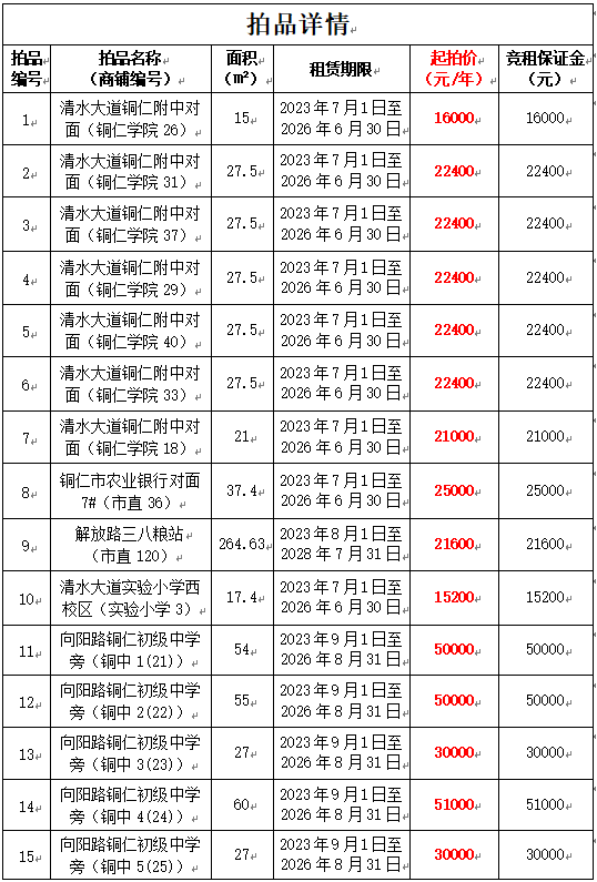 15、向陽(yáng)路銅仁初級(jí)中學(xué)旁(銅中5(25)),面積:27㎡,租賃期:2023年9月1日至2026年8月31日,起拍價(jià):30000元/年,競(jìng)租保證金:30000元。