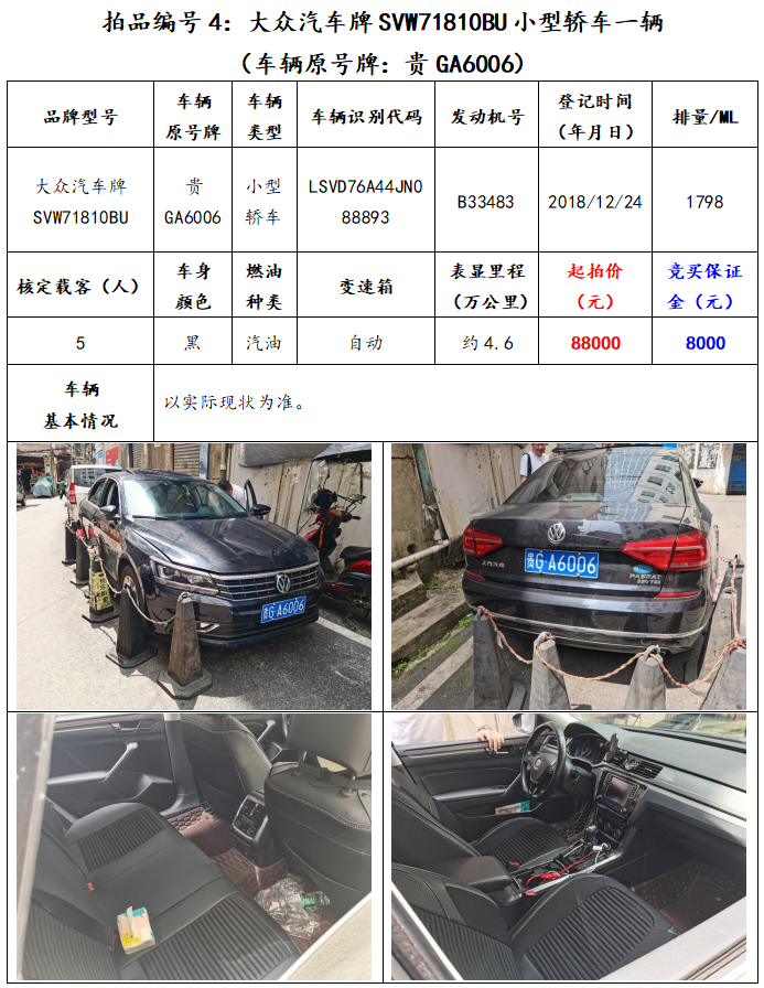 拍品編號4:大眾汽車牌SVW71810BU小型轎車一輛(車輛原號牌:貴GA6006)