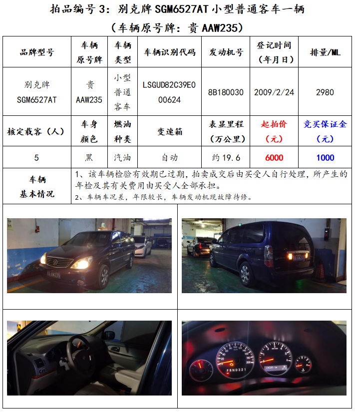 拍品編號3:別克牌SGM6527AT小型普通客車一輛(車輛原號牌:貴AAW235)