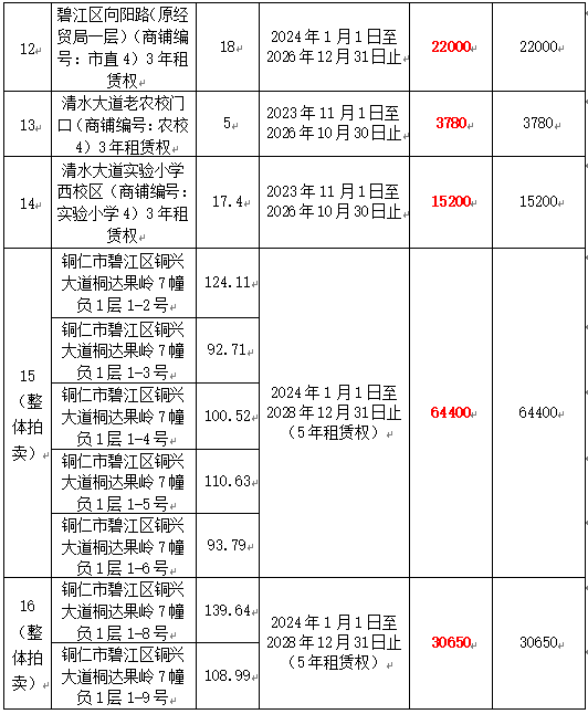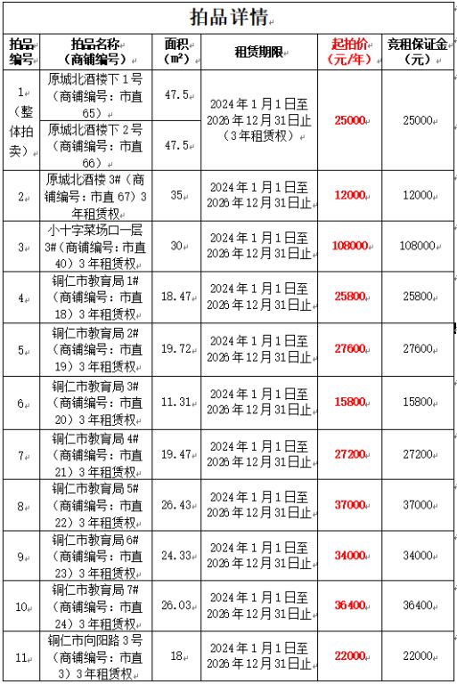 11、銅仁市向陽路3號(hào)(商鋪編號(hào):市直3)3年租賃權(quán),面積:18㎡,租賃期:2024年1月1日至2026年12月31日止,起拍價(jià):22000元/年,競(jìng)租保證金:22000元;