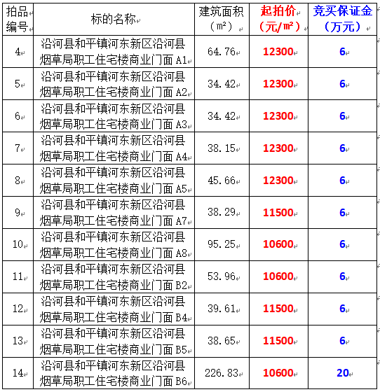 4、沿河縣和平鎮(zhèn)河?xùn)|新區(qū)沿河縣煙草局職工住宅樓商業(yè)門(mén)面11間,建筑面積:34.42㎡-226.83㎡,起拍價(jià):10600元/㎡-12300元/㎡,競(jìng)買(mǎi)保證金:6萬(wàn)元/間。
