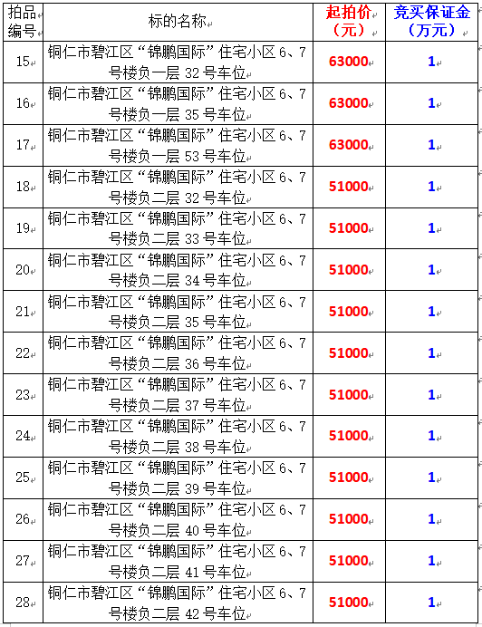 5、銅仁市碧江區(qū)“錦鵬國(guó)際”住宅小區(qū)6、7號(hào)樓負(fù)一層;32號(hào)、35號(hào)、53號(hào),負(fù)二層;32號(hào)-47號(hào)共計(jì)19個(gè)車(chē)位,起拍價(jià):51000元-63000元,競(jìng)買(mǎi)保證金:1萬(wàn)元/個(gè)。