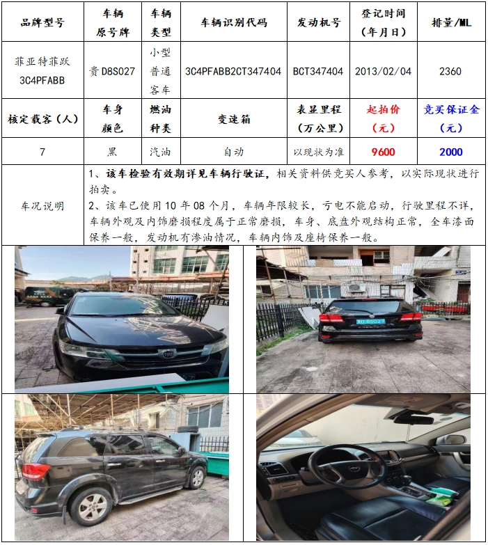 拍品編號(hào)1:菲亞特菲躍3C4PFABB小型普通客車一輛(車輛原號(hào)牌:貴GC0249);