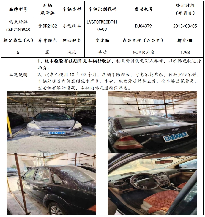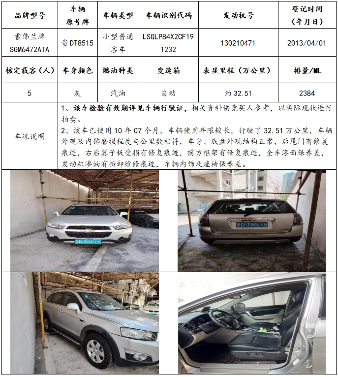 拍品編號1:菲亞特牌、??怂古啤⒀┓鹛m牌、昊銳牌等共4輛(整體拍賣)。一、展樣時(shí)間:公告之日起至2023年12月15日(工作日上午9:00—下午17:00)二、展樣地點(diǎn):標(biāo)的物所在地(請聯(lián)系我公司查看標(biāo)的)三、報(bào)名時(shí)間:公告之日起至2023年12月19日12:00(以保證金到賬時(shí)間為準(zhǔn)。)(https://paimai.caa123.org.cn/pages/meeting/conference.html?id=253855)1、請?jiān)谥信钠脚_(tái)上完成注冊登記,并上傳有效身份證明進(jìn)行實(shí)名認(rèn)證(個(gè)人:身份證原件;企業(yè):營業(yè)執(zhí)照、法人身份證照片)2、意向競買人應(yīng)在規(guī)定報(bào)名時(shí)間內(nèi)交納競買保證金及資料服務(wù)費(fèi)300元/輛(資料服務(wù)費(fèi)不退)到我公司指定銀行賬戶,取得競買資格。六、其他說明:為保證報(bào)名成功,避免轉(zhuǎn)賬失敗等情況,競買人轉(zhuǎn)賬后請及時(shí)與我公司聯(lián)系,確認(rèn)其競買資格。七、公司地址:貴州省貴陽市南明區(qū)中華南路20號新大陸廣場10樓D座