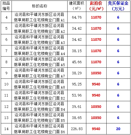 4、沿河縣和平鎮(zhèn)河東新區(qū)沿河縣煙草局職工住宅樓商業(yè)門面11間,建筑面積:34.42㎡-226.83㎡,起拍價:9540元/㎡-11070元/㎡,競買保證金:6萬元/間。