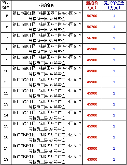 拍品編號15-33:銅仁市碧江區(qū)“錦鵬國際”住宅小區(qū)6、7號樓負一層:32號、35號、53號,負二層:32號-47號共計19個車位
