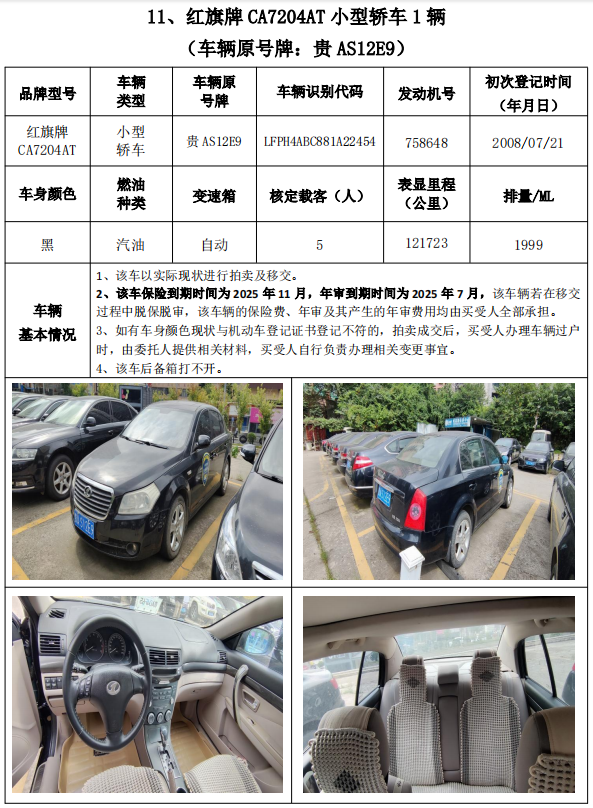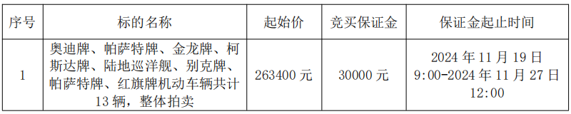 拍品編號1:奧迪牌、帕薩特牌、金龍牌、柯斯達(dá)牌、陸地巡洋艦、別克牌、帕薩特牌、紅旗牌機(jī)動車輛共計(jì)13輛,整體拍賣
