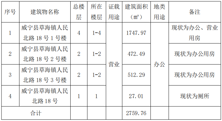 標(biāo)的坐落于威寧縣草海鎮(zhèn)人民北路18號(hào)稱為1號(hào)樓、2號(hào)樓和3號(hào)樓的三項(xiàng)房屋,房屋建筑面積為:2759.76㎡,混合結(jié)構(gòu),房屋總層數(shù)為4層,拍賣標(biāo)的所在層數(shù)為1-4層,產(chǎn)權(quán)證號(hào):威房權(quán)證草海鎮(zhèn)字第00007730號(hào),設(shè)計(jì)用途為營(yíng)業(yè)。土地證號(hào):威國(guó)用(2009)第133號(hào),地類(用途):辦公用地,使用權(quán)類型:作價(jià)出資,使用權(quán)面積:1854.70㎡。