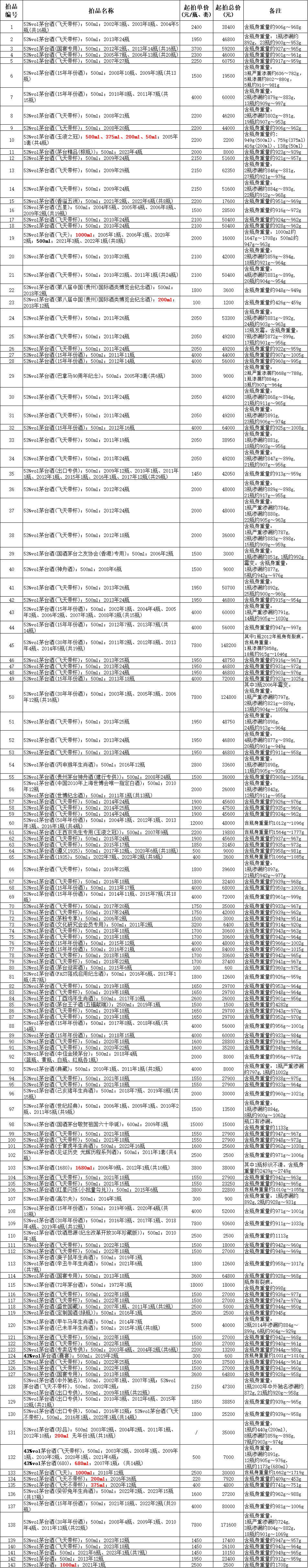 罰沒(méi)物品——貴州茅臺(tái)酒約2200瓶(其中有各類茅臺(tái)酒及各類生肖酒、15年、30年、50年年份酒,還有巴拿馬90周年紀(jì)念酒、世博紀(jì)念酒及多款特制紀(jì)念酒),詳見(jiàn)《拍賣(mài)標(biāo)的清單》。