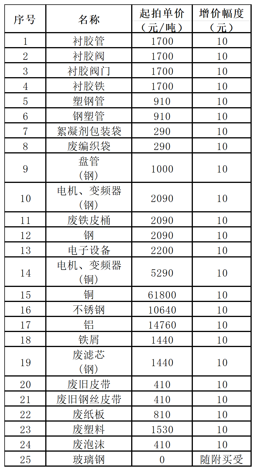 襯膠管每增加10元/噸,第2-24項(xiàng)廢舊材料同步增加10元/噸;買受人買受1-24項(xiàng)廢舊材料的同時(shí),以起拍價(jià)隨附買受第25項(xiàng)廢舊材料。