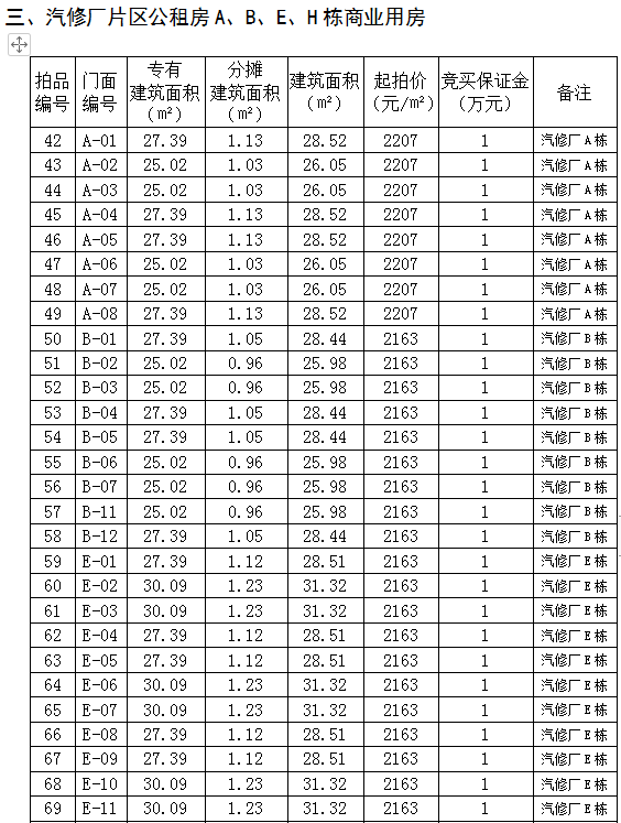 3、汽修廠片區(qū)公租房A、B、E、H棟商業(yè)用房49間,建筑面積:25.98㎡-31.32㎡,起拍價(jià):2120元/㎡—2207元/㎡,競(jìng)買保證金1萬元/間。