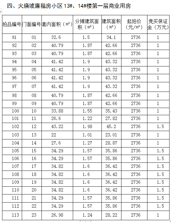 4、火燒坡廉租房小區(qū)13#、14#樓第一層商業(yè)用房23間,建筑面積:23.01㎡-43.32㎡,起拍價(jià):2736元/㎡,競(jìng)買保證金1-1.5萬元/間。