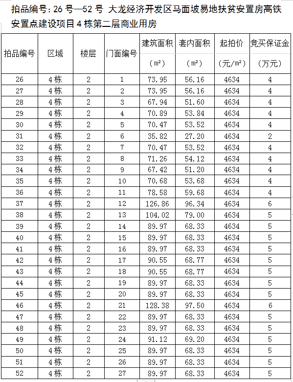 3、大龍經(jīng)濟(jì)開發(fā)區(qū)馬面坡易地扶貧安置房高鐵安置點(diǎn)建設(shè)項(xiàng)目4棟第三層商業(yè)用房23間,建筑面積為54.88㎡-102.06㎡,起拍價(jià):3370元/㎡,競(jìng)買保證金2—4萬(wàn)元/間;