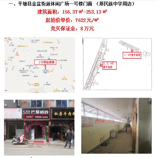 標(biāo)的位于平塘縣金盆街道休閑廣場,相當(dāng)于縣中心,人流量大,交通便利,停車場數(shù)量多,商業(yè)繁華程度較好;一號樓建成于1995年,總層數(shù)7層,1-2層為商業(yè);建筑面積:156.37㎡-253.13㎡,建筑結(jié)構(gòu)為磚混,外墻為貼磚,土地性質(zhì):國有劃撥,土地用途:商業(yè)用地;區(qū)域內(nèi)公共配套設(shè)施有平塘民族中學(xué)、平塘中等職業(yè)學(xué)校、貴品廣場等。