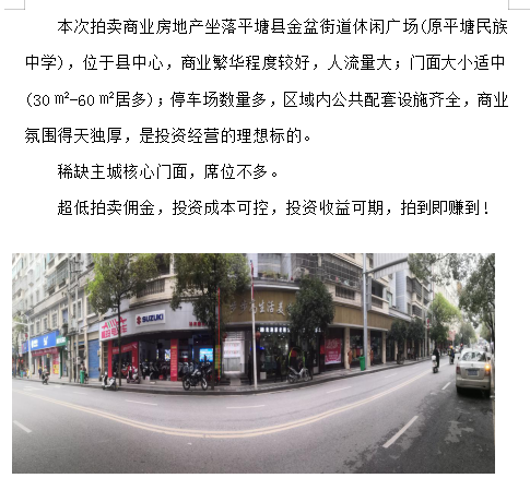 標(biāo)的位于平塘縣金盆街道休閑廣場,相當(dāng)于縣中心,人流量大,交通便利,停車場數(shù)量多,商業(yè)繁華程度較好;四號樓建成于2004年,總層數(shù)8層,1層為商業(yè);建筑面積:34.14㎡-151.19㎡,建筑結(jié)構(gòu)為磚混,外墻為貼磚,土地性質(zhì):國有劃撥,土地用途:商業(yè)用地;區(qū)域內(nèi)公共配套設(shè)施有平塘民族中學(xué)、平塘中等職業(yè)學(xué)校、貴品廣場等。