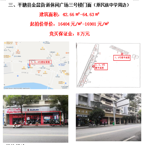 標(biāo)的位于平塘縣金盆街道休閑廣場,相當(dāng)于縣中心,人流量大,交通便利,停車場數(shù)量多,商業(yè)繁華程度較好;三號樓建成于2004年,總層數(shù)7層,1層為商業(yè);建筑面積:42.66㎡-64.63㎡,建筑結(jié)構(gòu)為磚混,外墻為貼磚,土地性質(zhì):國有劃撥,土地用途:商業(yè)用地;區(qū)域內(nèi)公共配套設(shè)施有平塘民族中學(xué)、平塘中等職業(yè)學(xué)校、貴品廣場等。