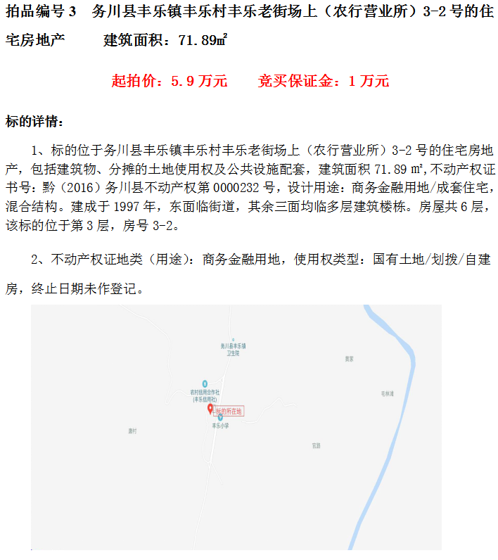 三、務川縣豐樂鎮(zhèn)豐樂村豐樂老街場上(農行營業(yè)所)3-2號的住宅房地產(建筑面積71.89㎡);