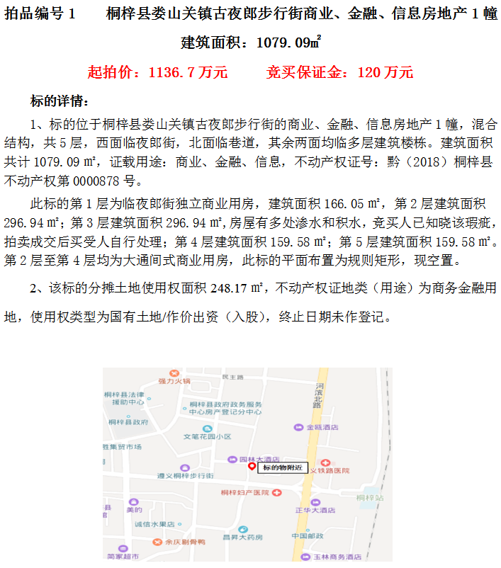 一、桐梓縣婁山關鎮(zhèn)古夜郎步行街商業(yè)、金融、信息房地產1幢(建筑面積1079.09㎡)