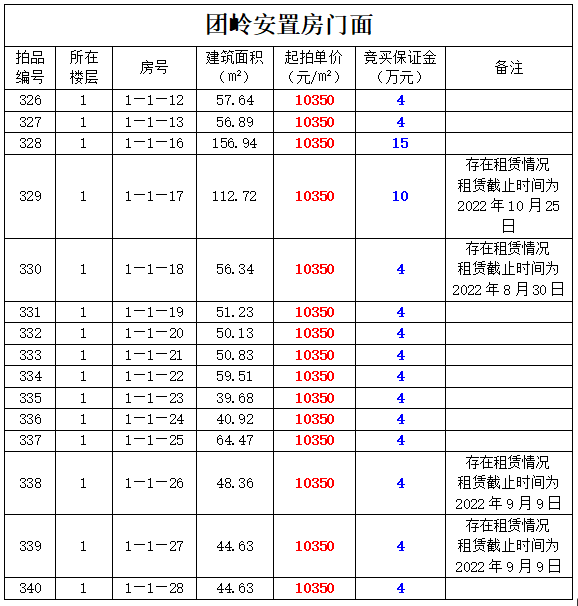 3、團(tuán)嶺安置房門(mén)面36間,建筑面積:39.68㎡-1123.98㎡,起拍單價(jià):3690—10350元/㎡;