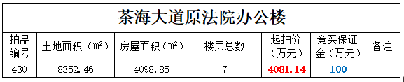 6、茶海大道原法院辦公樓,土地面積:8352.46㎡,房屋面積:4098.85㎡,起拍價(jià):4081.14萬(wàn)元;