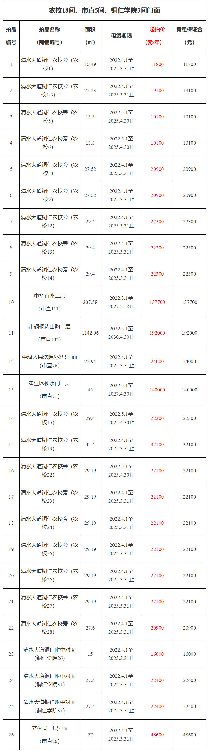 25、清水大道銅仁附中對面(商鋪編號:銅仁學(xué)院37),面積:27.5㎡,租賃期:3年,起拍價(jià):22400元/年,競租保證金:22400元;