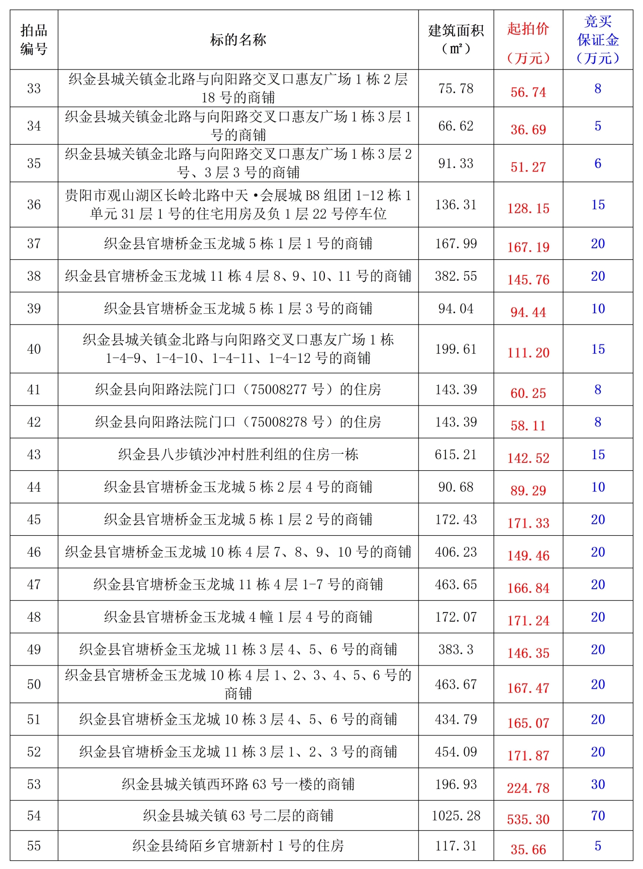受委托,我公司定于2022年12月26日(星期一)14:30時,在織金縣金中路57號(織金農(nóng)商銀行二樓會議室)公開拍賣以下標的:織金縣房地產(chǎn)55處。(詳見標的清單)