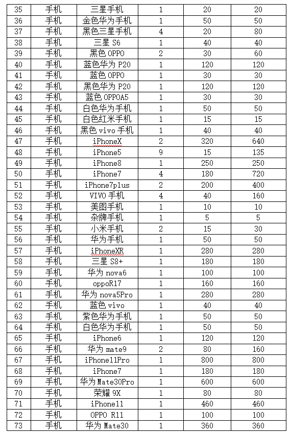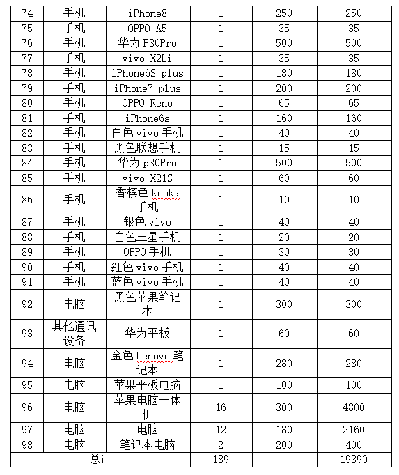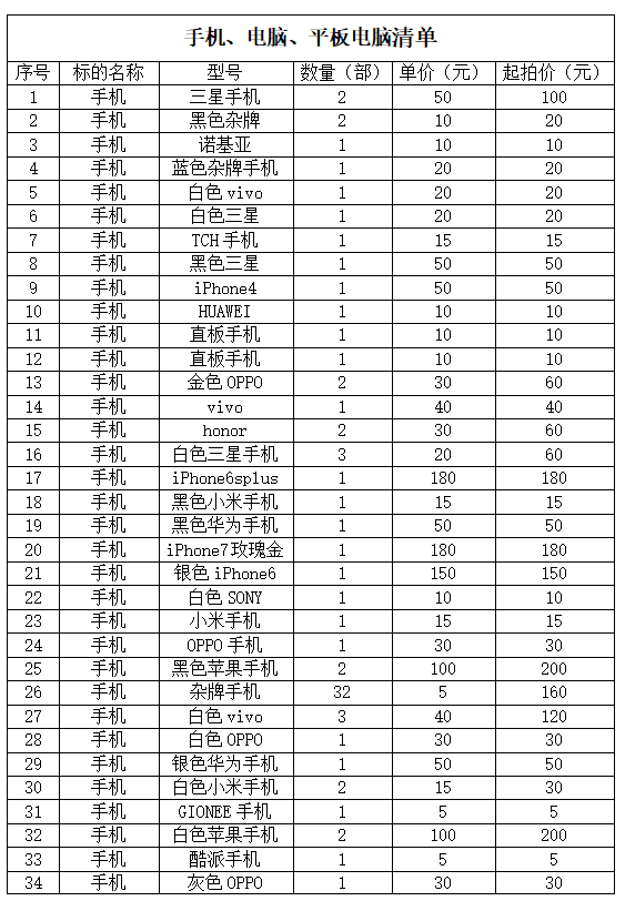 該批標(biāo)的包含各類品牌手機(jī)155部、電腦33臺(tái)、平板電腦1臺(tái)。(詳見后附手機(jī)、電腦、平板電腦清單),該批手機(jī)、電腦、平板電腦因長(zhǎng)期閑置,存在電池?zé)o電,無法開機(jī)等影響使用的情況。