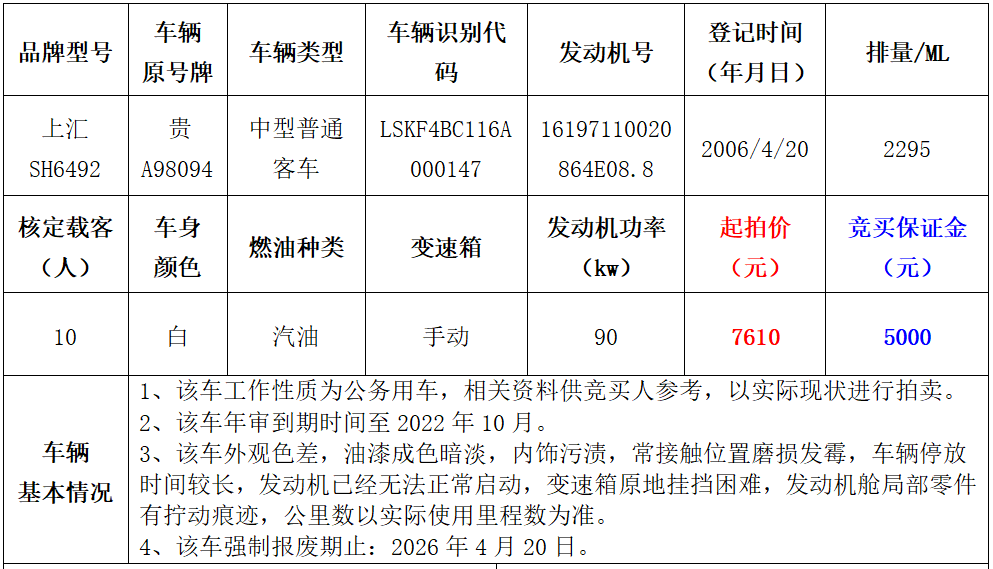 【已結(jié)束】上匯SH6492中型普通客車1輛