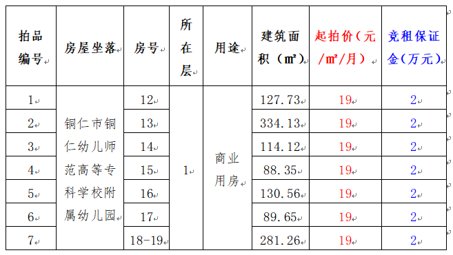 拍品編號1-7號:銅仁幼兒師范高等??茖W校附屬幼兒園12至19號商業(yè)用房房地產(chǎn)