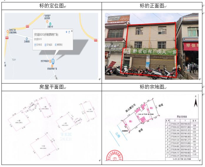 標(biāo)的坐落于安龍縣興隆鎮(zhèn)當(dāng)朝村狗廠組,房屋總層數(shù)3其中1幢1-3層證載建筑面積:297.04㎡,2幢1層證載建筑面積:3.8㎡,3幢1層證載建筑面積:48.29㎡,房屋產(chǎn)權(quán)證號:安房權(quán)證興隆鎮(zhèn)字第00003465號,設(shè)計(jì)用途分別為辦公住宅、住宅,混合結(jié)構(gòu);土地使用權(quán)證號:安國用(2014)第13號,證載土地使用權(quán)面積:251.3㎡,實(shí)測土地使用權(quán)面積251.28㎡,地類(用途)金融用地,使用權(quán)類型為出讓,終止日期為2054年11月22日止。