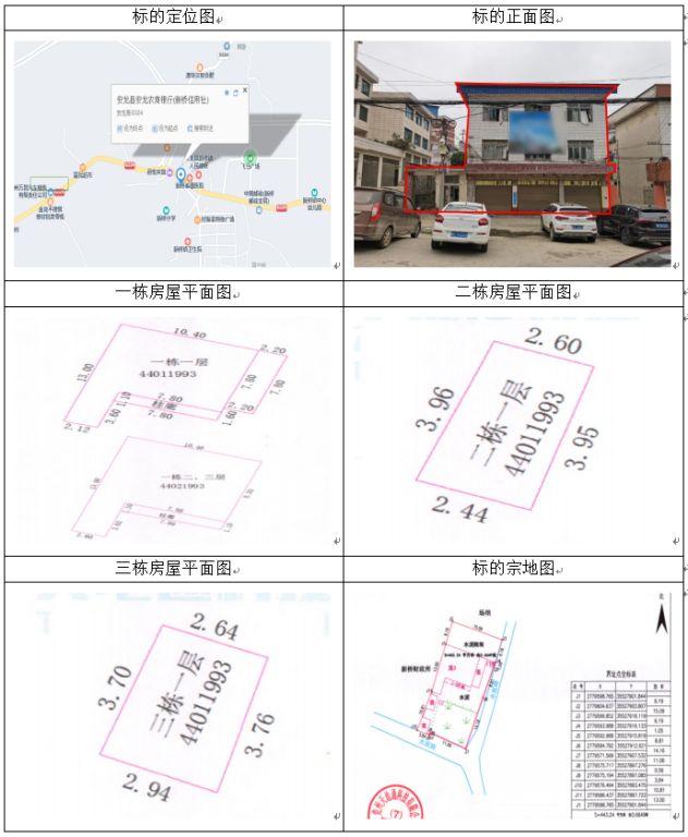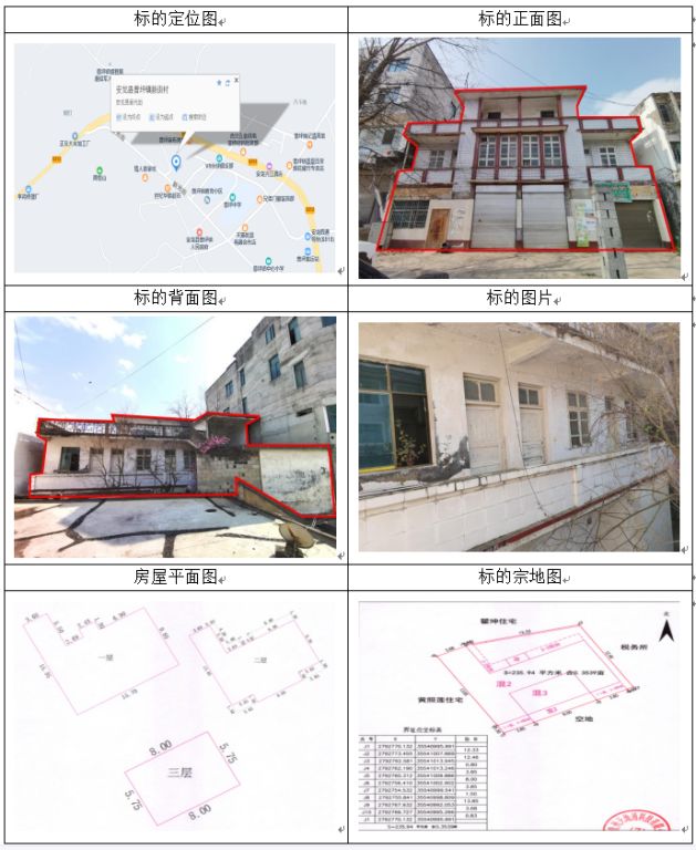 標(biāo)的坐落于安龍縣新橋鎮(zhèn)新橋居委會,房屋總層數(shù)3,其中1幢1-3層證載建筑面積:312.26㎡,實(shí)測建筑面積:338.52㎡,2幢1層證載建筑面積:10.81㎡,實(shí)測建筑面積:9㎡,3幢1層證載建筑面積:9.72㎡,實(shí)測建筑面積:10.42㎡,房屋產(chǎn)權(quán)證號:安房權(quán)證新橋鎮(zhèn)字第00003462號,設(shè)計(jì)用途分別為辦公住宅、其它,混合結(jié)構(gòu);土地使用權(quán)證號:安國用(2014)第20號,證載土地使用權(quán)面積:443.24㎡,實(shí)測土地使用權(quán)面積443.24㎡,地類(用途)金融用地,使用權(quán)類型為出讓,終止日期為2054年11月22日止。